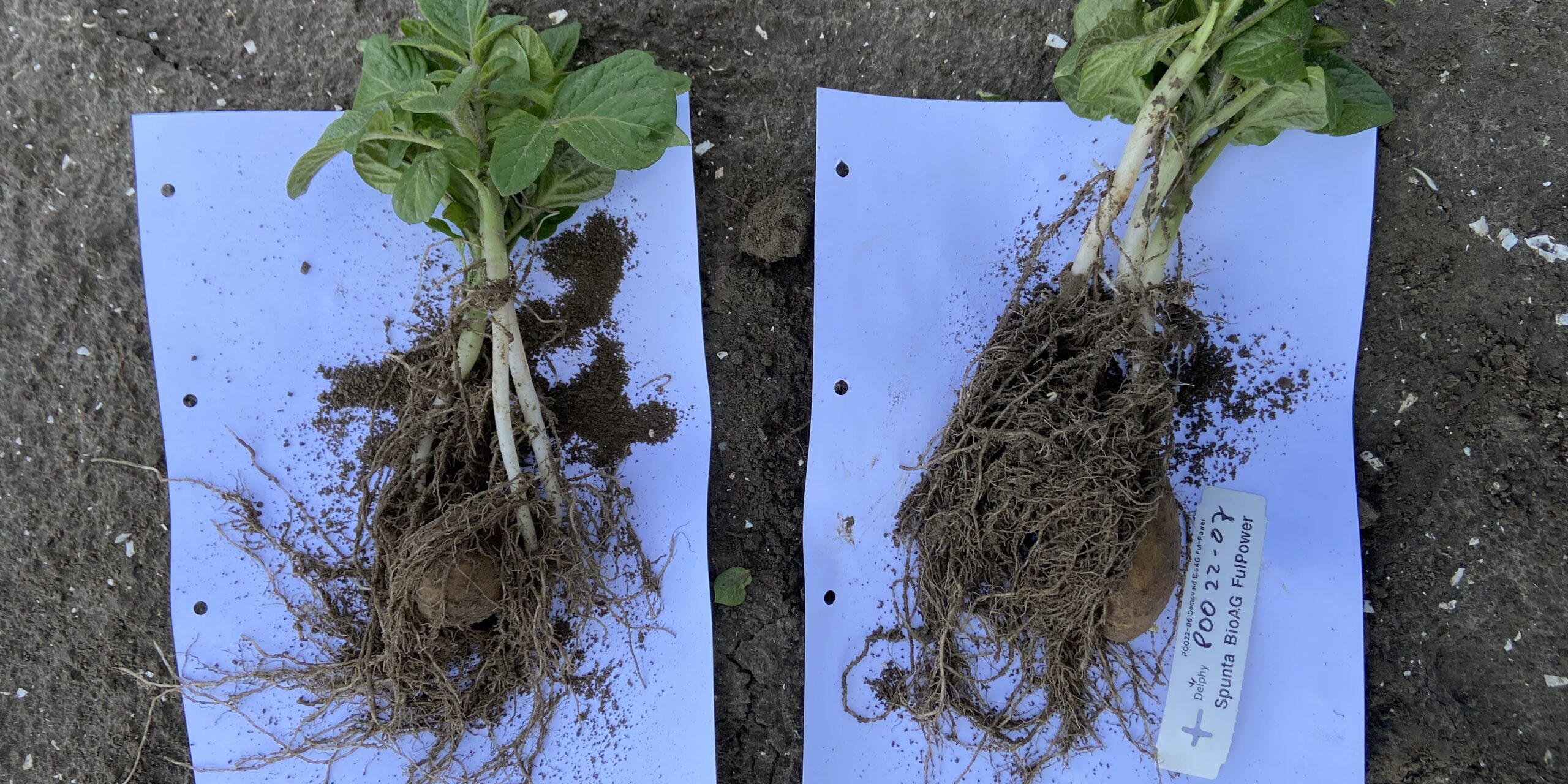 Op de foto’s is het verschil in opkomst tijdens een van onze praktijkproeven duidelijk zichtbaar. Bij de aardappelen op de linker foto onderaan dit bericht is Ful-Power bij het poten toegevoegd. De opkomst is een stuk sneller dan de aardappelen zonder Ful-Power op de rechter foto. Het verschil in ontwikkeling is duidelijk zichtbaar, terwijl de pootdatum, gewasbescherming en omstandigheden exact gelijk zijn. De planten die met Ful-Power zijn behandeld, hebben een uitgebreider wortelnetwerk. Deze snelle start werkt het hele groeiseizoen door. Volgend jaar gaan we dit verder onderzoeken.