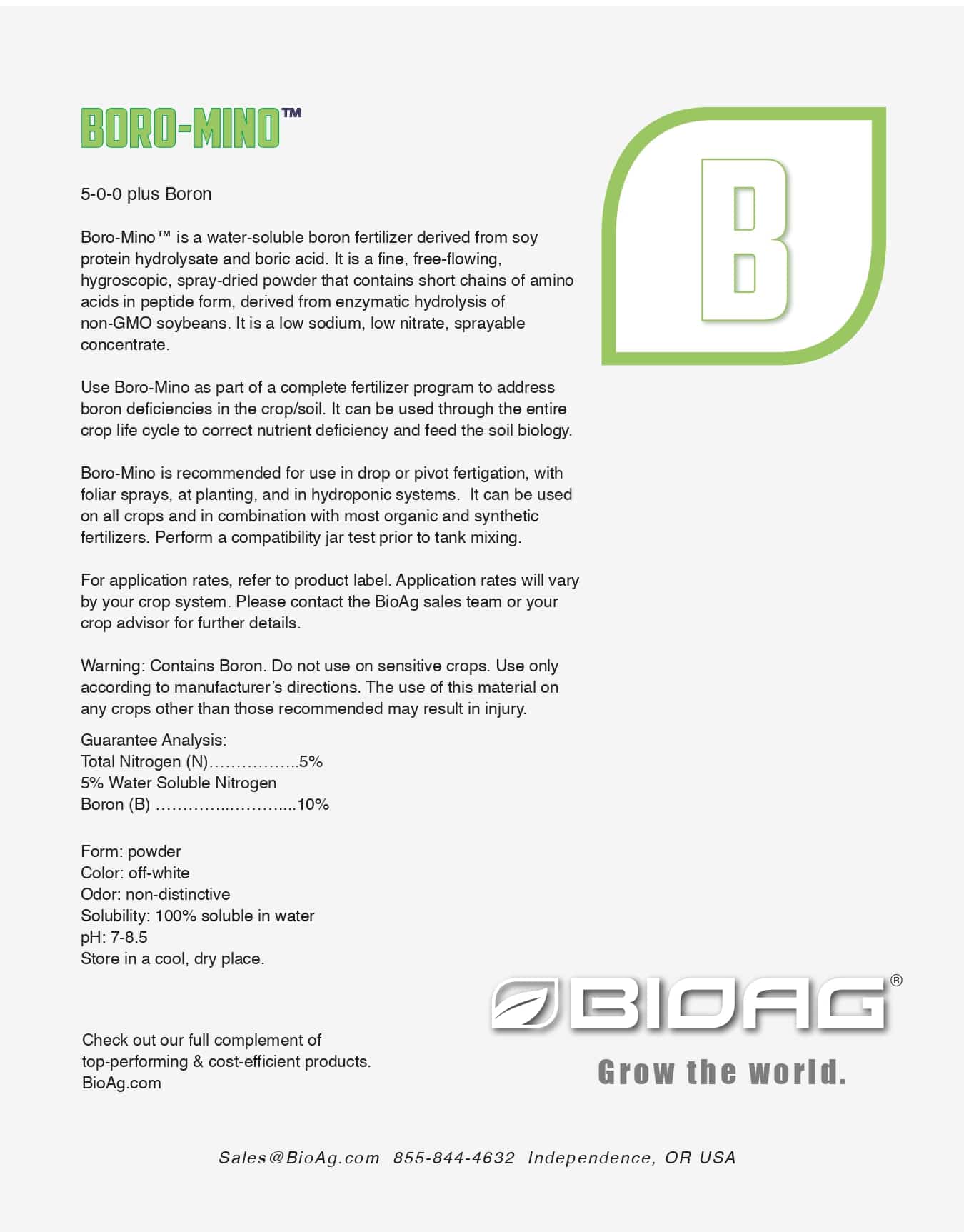 Boro-Mino® is een wateroplosbare boriummeststof op basis van soja-eiwithydrolysaat en boriumzuur. Het is een fijn, vrij stromend, hygroscopisch, gesproeidroogd poeder dat korte ketens aminozuren in peptidevorm bevat, afgeleid van enzymatische hydrolyse van non-GMO sojabonen. Het is een natriumarm, nitraatarm, verstuifbaar concentraat. Boro-Mino kan worden gebruikt als onderdeel van een compleet bemestingsprogramma om tekorten aan voedingsstoffen in het gewas of de bodem aan te vullen. Het kan gedurende de hele levenscyclus van de het gewas worden gebruikt.